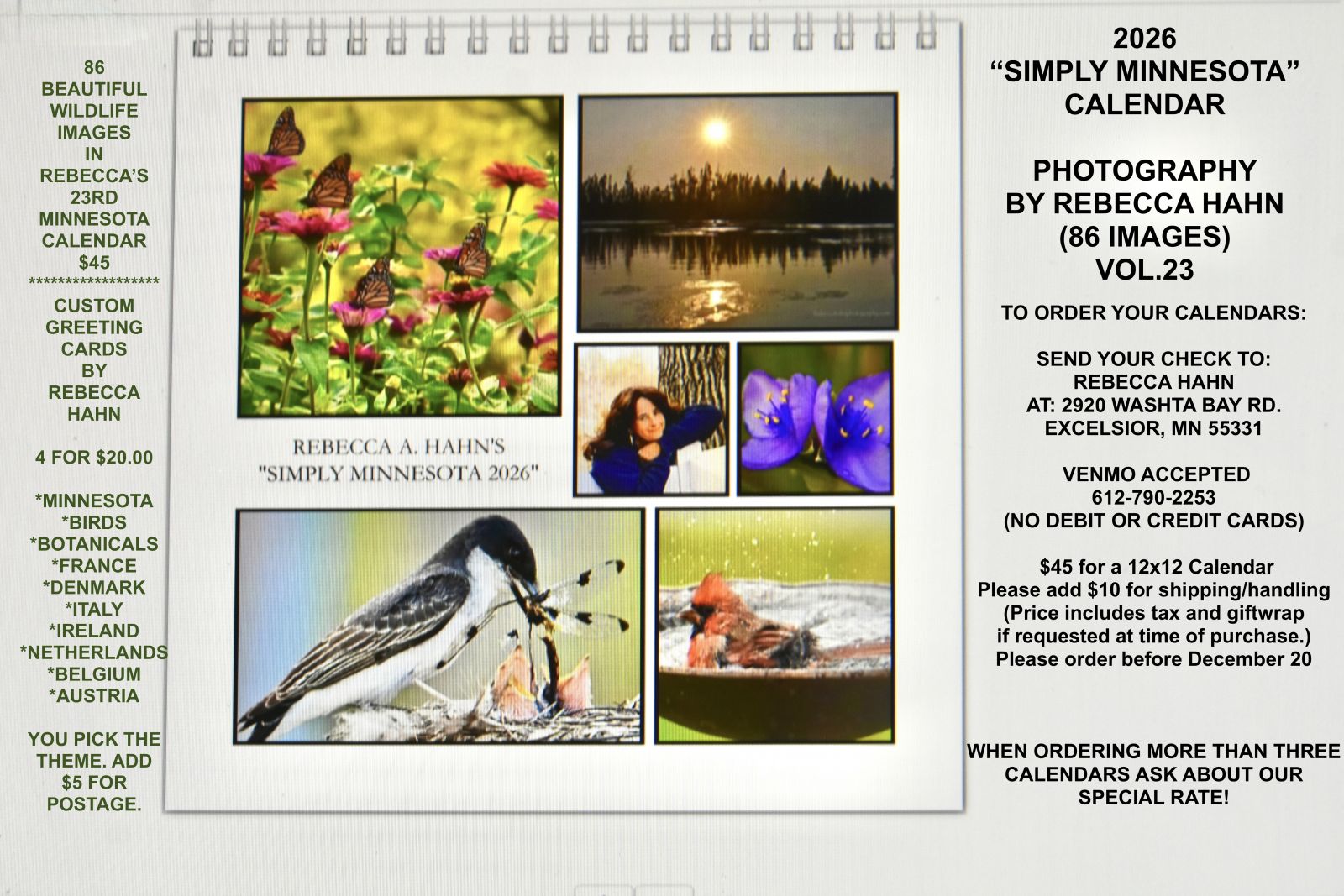 Each year I love sharing with you the oportunity to purchase my wife's Annual Calendar.  Rebecca was paralyzed in 2016, yet she continues to photograph amazing wildlife from Minnesota to share with all of our friends and clientele. I am so proud of her.  This year our local ABC affiliate will be promoting Rebecca's 2026 calendar "SIMPLY MINNESOTA" on November 5th.  She has also been asked by that network to become their official "Back Yard Birding Expert."  I don't know if she'll accept the job, but in the meantime why not buy her calendar?  All the info is listed on the image below!  Thank you for your support!